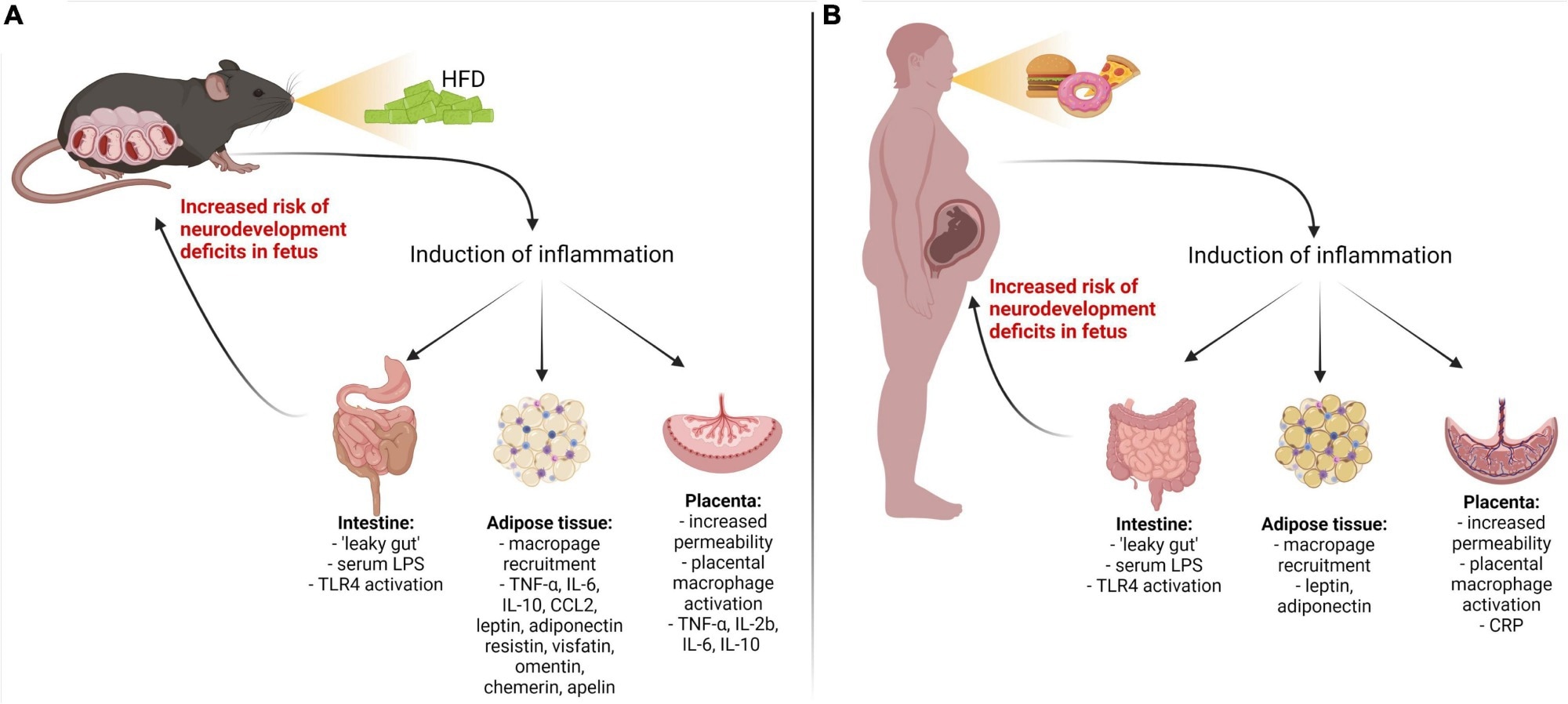 Inflammatory pathways are activated by a maternal high-fat diet-induced metabolic disease. Metabolic disorders in pregnant mouse dams (A) and women (B) result in the upregulation of pro-inflammatory cytokines/adipokines through the gut, adipose, and placental pathways. LPS, lipopolysaccharide; TLR4, Toll-like receptor 4; IL-1β, IL-6, IL-8, IL-17a – interleukins 1 beta, 6, 8, 17a; TNF-α, tumor necrosis factor-alpha; CRP, C-reactive protein; CCL2, chemokine (C–C motif) ligand; IFN-γ, interferon-gamma.8