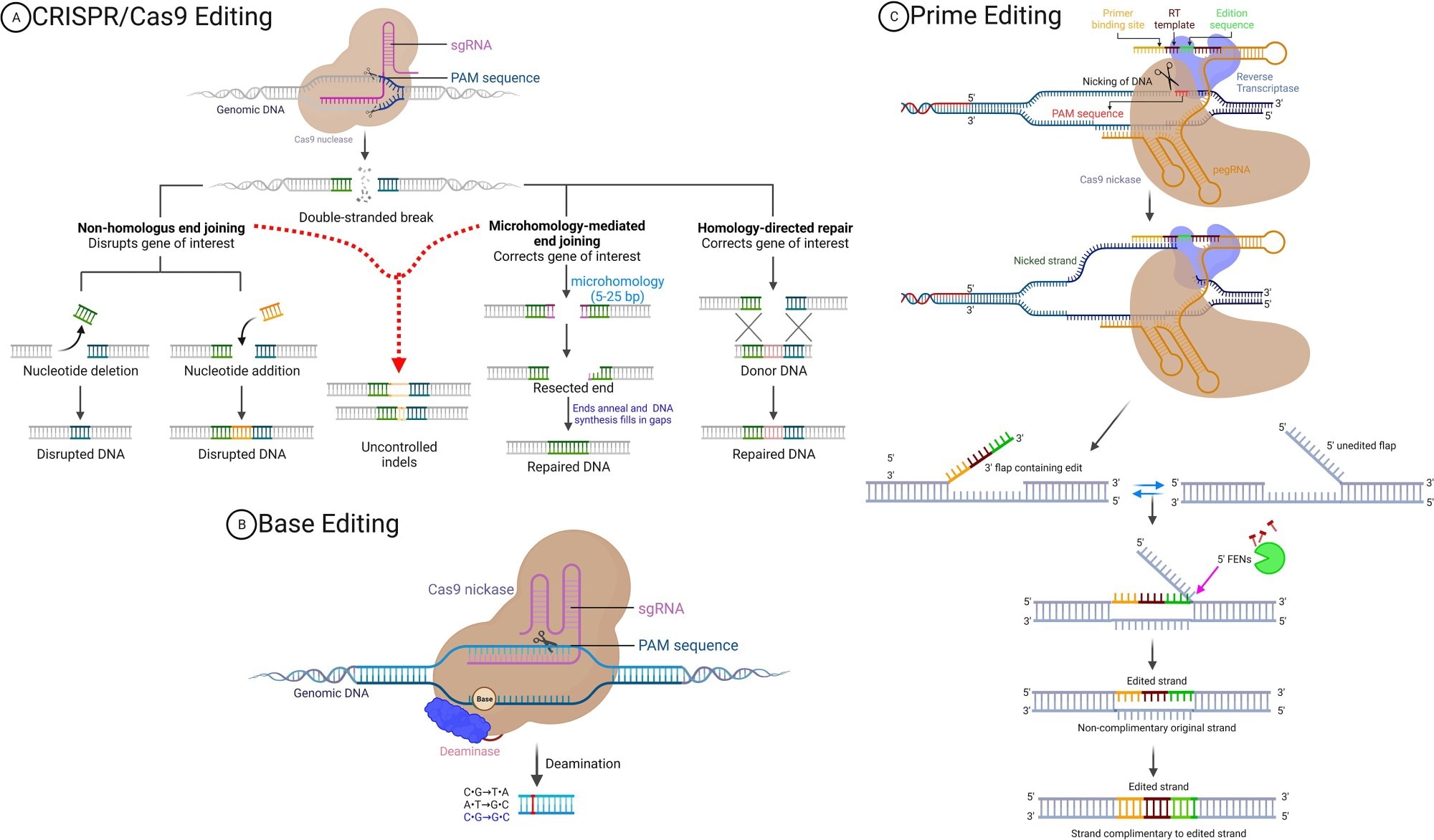 Prime editors (PEs) consist of a three-component system including a Cas9 nickase, which is conjugated to an engineered reverse transcriptase paired with a prime editing guide ribonucleic acid (pegRNA). Initially, pegRNA will bind to the target DNA sequence through complementary base pairing, following which the Cas9 nickase nicks the non-target strand.