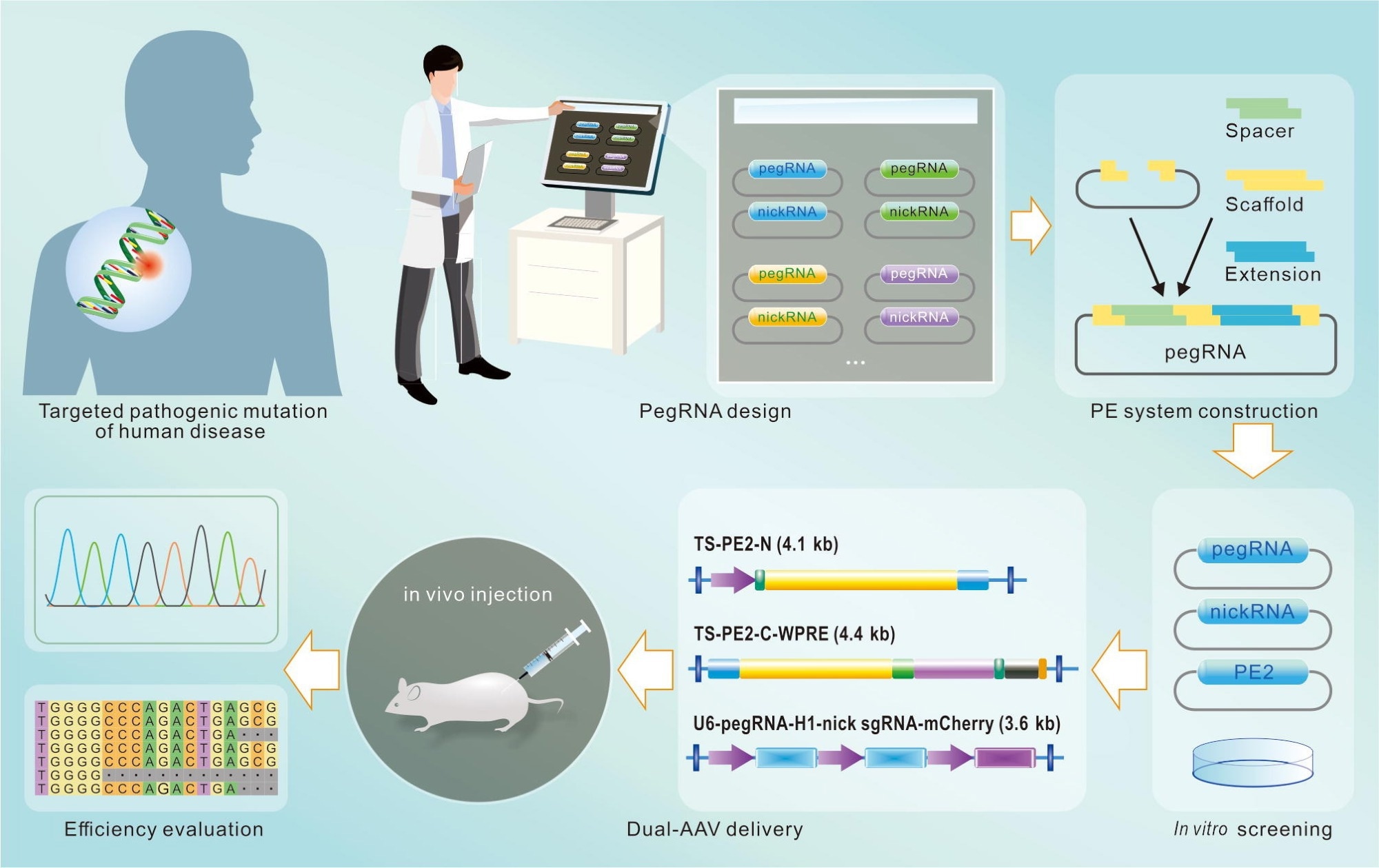 The flowchart of PE design and application. Prime editing is used to treat genetic diseases with specific pathogenic mutations. Some websites may help to design a variety of candidate pegRNAs and nsgRNAs, which are then constructed by means of the golden gate assembly technique. Subsequently, these plasmids are applied for in vitro screening to choose the pegRNA and nsgRNA with the best performance. These well-performed RNAs are then constructed into a dual-AAV system. After being injected into the mouse model, the editing efficiency and off-target events of prime editing are finally evaluated.The flowchart of PE design and application. Prime editing is used to treat genetic diseases with specific pathogenic mutations. Some websites may help to design a variety of candidate pegRNAs and nsgRNAs, which are then constructed by means of the golden gate assembly technique. Subsequently, these plasmids are applied for in vitro screening to choose the pegRNA and nsgRNA with the best performance. These well-performed RNAs are then constructed into a dual-AAV system. After being injected into the mouse model, the editing efficiency and off-target events of prime editing are finally evaluated.