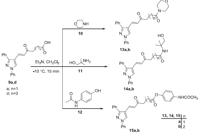 Preparation of pyrazole amides 13a,b, 14a,b and pyrazole esters 15a,b. Image Credit: Image courtesy of Nermeen Ali et al., in partnership with ELRIG (UK) Ltd.