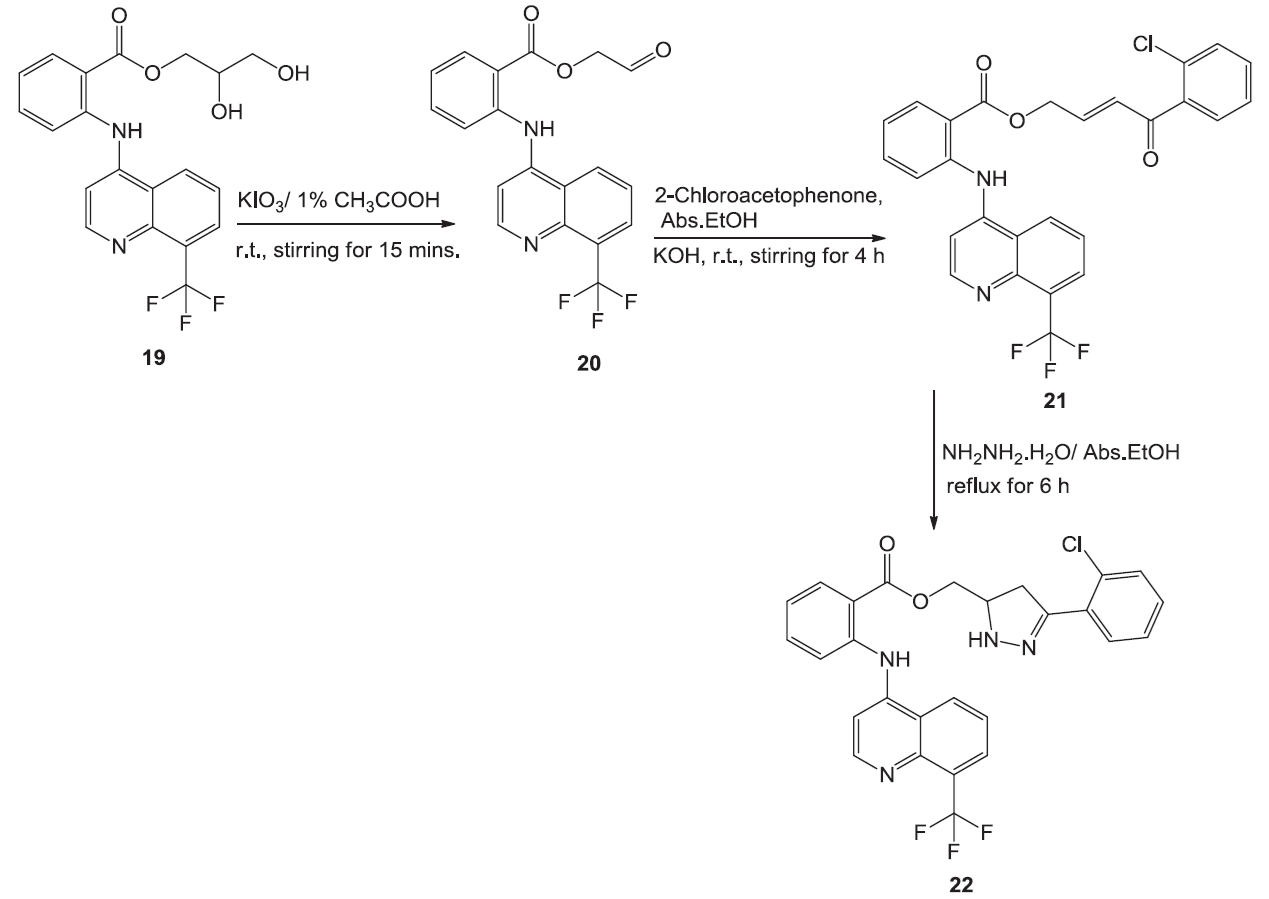 Preparation of Floctafenine chalcone 21 and pyrazoline 22.