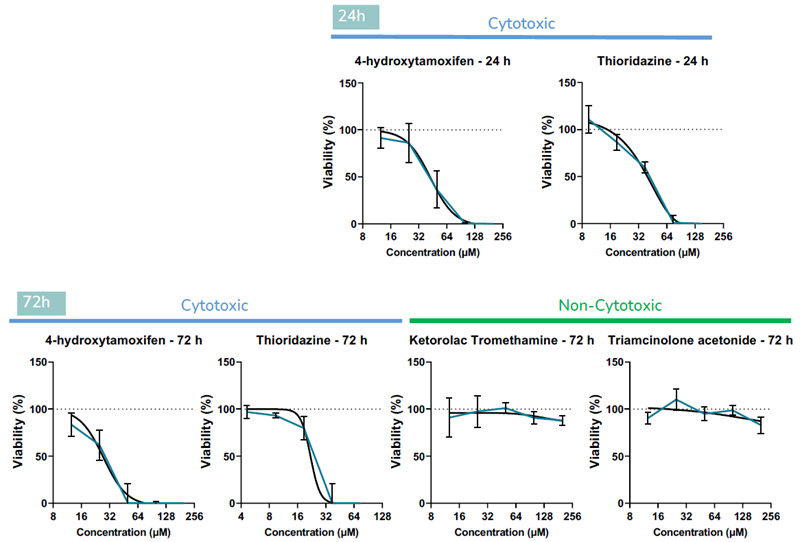 B. Retinal organoids were treated with known retinotoxins (4- hydroxytamoxifen and thioridazine), and agents known to be non-toxic to retina in vivo (ketorolac and triamcinolone acetonide) across a range of concentrations. Viability assays demonstrated that organoids respond to the compounds in a predictive doseresponse manner after 24 and 72 h of incubation. Data is presented as mean ± SD (N≥4). Image Credit: Newcells Biotech