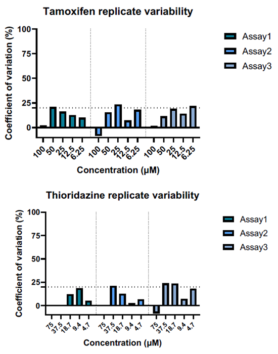 C. Organoid viability experiments were repeated across batches to demonstrate result consistency. The coefficient of variation was calculated by dividing the standard deviation (SD) by the replicate mean, and multiplied X100. Coefficient of variation % ≤ 20 % indicates good assay reproducibility.