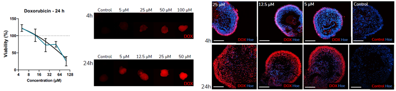 D. Retinal organoids were assessed for their suitability for studies with small molecules. In order to test whether small molecules penetrate the organoids, doxorubicin was used as a test compound. The intrinsic fluorescence of doxorubicin facilitates visualization of the drug penetration. Exposure of the iPSC-derived retinal organoids to doxorubicin reduced cell viability in a dose-dependent manner. Immunofluorescence analysis showed that doxorubicin penetrates the organoids after 4 and 24 h incubation.
