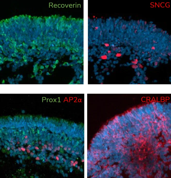 A. At day 150 of differentiation, retinal organoids contain major retinal cell types, including photoreceptors (Recoverin), retinal ganglion cells (SNCG), amacrine cells (AP2α), horizontal cells (Prox1) and Muller glia (CRALBP). Image Credit: Newcells Biotech