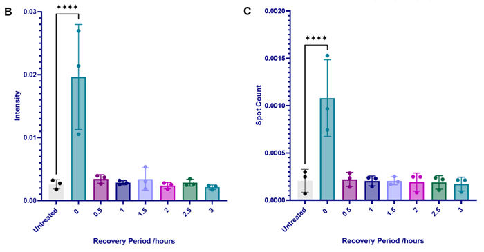 Figure 3. Sorbitol SG disassembly dynamics in U-2 OS cells. (A) U-2 OS cells were treated with sorbitol (400 mM, 1 hour), after which the media was replaced to return cells to basal conditions for 0.5 – 3 hours. Cells were immunolabelled with G3BP1 (green) and dyed with Hoechst (blue) and CellMask (red) (scale bar = 100 μM). Stress granules were induced and subsequently disassembled within 0.5 hours of sorbitol removal. This is shown in quantification of (B) relative G3BP1 spot intensity, (C) average number of G3BP1 spots per cytoplasm area, and cytoplasmic G3BP1 spot area (not shown). Statistical analysis: one-way ANOVA with Dunnett’s multiple comparisons test (**** = p< 0.0001). Image Credit: Image courtesy of Daisy Maiden et al., in partnership with ELRIG (UK) Ltd.