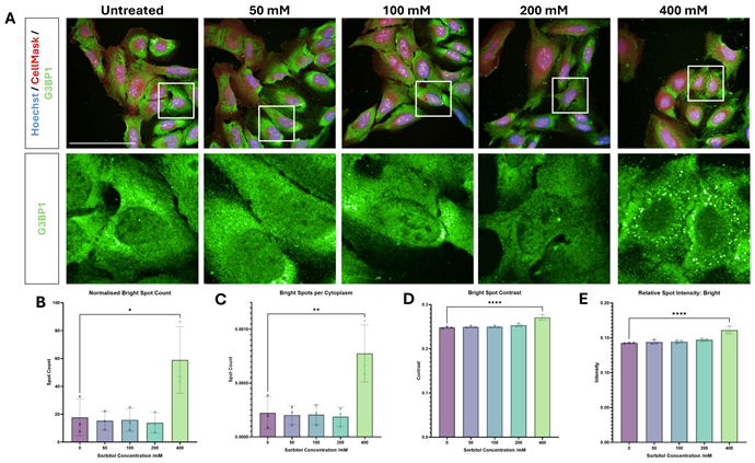 Figure 2. Thapsigargin- and sorbitol-induced stress response in U-2 OS. U-2 OS cells were treated with (A) 0.25 μM – 4 μM thapsigargin for 2 hours, or (B) 50 mM - 400 mM sorbitol for 1 hour, and immunolabelled for G3BP1 (green) and dyed with Hoechst (blue) and CellMask (red) (scale bars = 100 μM). Thapsigargin did not induce a consistent stress response, as evidenced in quantification of (C) G3BP1 intensity in the cytoplasm, (D) G3BP1 intensity in the nucleus, (E) G3BP1 nuclear/cytoplasmic intensity ratio, (F) relative G3BP1 spot intensity, and (G) G3BP1 spot count per cytoplasm area. Stress granule formation was induced with 400 mM sorbitol, as shown in quantification of (H) G3BP1 bright spot count, (I) G3BP1 spot count per cytoplasm area, (J) G3BP1 spot contrast, and (K) relative G3BP1 spot intensity. Statistical analysis: one-way ANOVA with Dunnett’s multiple comparisons test (* = p< 0.05, ** = p< 0.01, **** = p< 0.0001). Image Credit: Image courtesy of Daisy Maiden et al., in partnership with ELRIG (UK) Ltd.