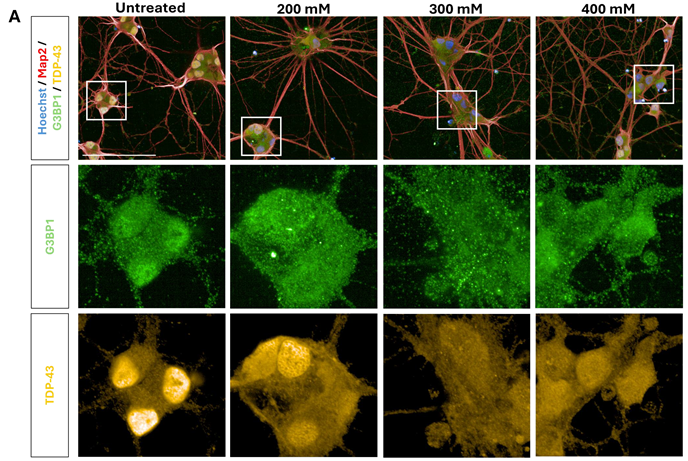 Figure 4. Sorbitol concentration gradient in motor neurons. (A) iPSC-derived motor neurons were treated with 50 mM – 400 mM sorbitol for 1 hour, then immunolabelled for G3BP1 (green), TDP-43 (yellow), Map2 (red), and dyed with Hoechst (blue) (Scale bar = 100 μM). SG formation was not reliably detected, as shown in (B) cytoplasmic G3BP1 spots normalized to cytoplasm area and (C) cytoplasmic TDP-43 spots normalized to cytoplasm area. Cell stress-induced changes in protein localization were detected at 200 mM – 400 mM, as seen in quantification of (D) G3BP1 nuclear/cytoplasmic localization ratio, and (E) TDP-43 nuclear/cytoplasmic localization ratio (a decreased ratio indicates increased relative localization to the cytoplasm). Statistical analysis: one-way ANOVA with Dunnett’s multiple comparisons test (** = p< 0.01, *** = p< 0.001, **** = p< 0.0001). Image Credit: Image courtesy of Daisy Maiden et al., in partnership with ELRIG (UK) Ltd.
