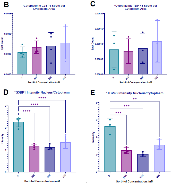 Incubation with sorbitol induced an ISR response in motor neurons, as evidenced by an altered nucleocytoplasmic ratio of both G3BP1 and TDP-43, with the strongest effect observed at 300 mM. Formation of SGs was variable, and a robust response could not be quantified using spot detection analysis.