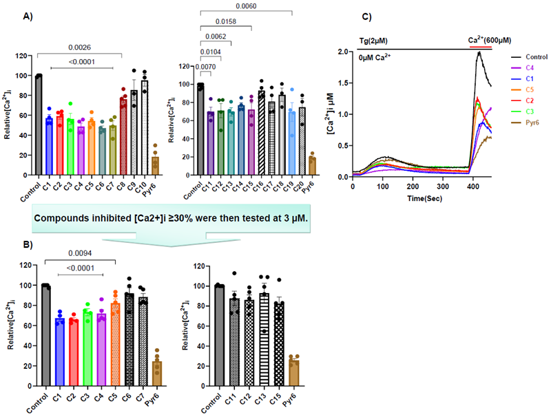 Figure 2. A) Bar diagrams represent the relative peak Ca2+ entry [Ca2+]i. Compounds initially tested at 10 μM. B) Compounds with ≥20 % inhibition were further explored for dose response assays. C) Representative Tg-evoked Ca2+ signal traces for C1-C4. Image Credit: Image courtesy of Aida Ashrafzadeh et al., in partnership with ELRIG (UK) Ltd.
