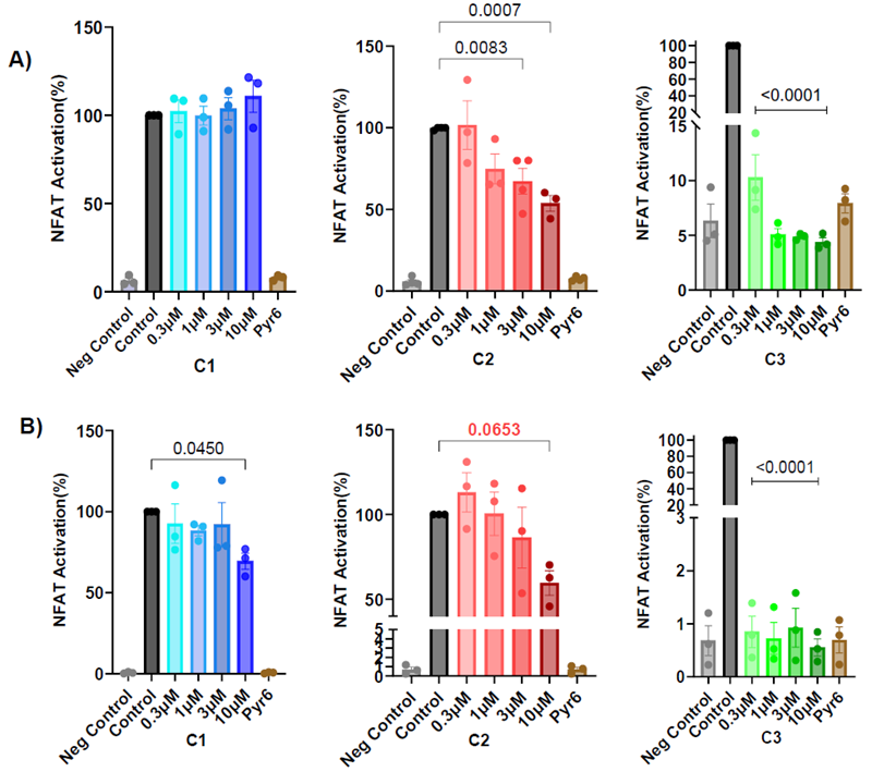 Figure 5. NFAT reporter assay following stimulation by TCR activation (A) or Tg (B) in Jurkat-Lucia™ NFAT-CD28 reporter cells treated with C1-C3. Image Credit: Image courtesy of Aida Ashrafzadeh et al., in partnership with ELRIG (UK) Ltd.