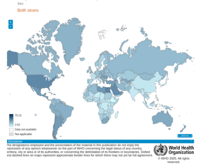 - Obesity is a multifactorial metabolic disease and a major global public health challenge currently affecting over one billion people worldwide. Its prevalence varies by region, as shown in the WHO map below (2022 data).