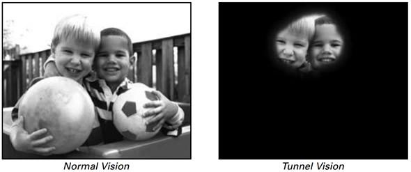 In Retinitis pigmentosa there are initial vision problems especially in dim light. This manifests as a loss of vision around the peripheries. This is known as tunnel vision. Central vision is spared until the later stages of the disease.