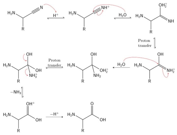• Stage 2: hydrolysis of the α-amino nitrile to produce an α-amino acid.