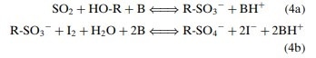 The KF reaction is based upon an early reaction called the Bunsen reaction, in which sulfur dioxide is oxidized by iodine with the consumption of water during this oxidation. The original reaction is as below:
