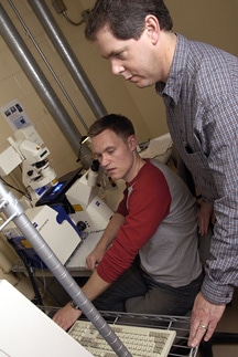 James Harden, right, and doctoral student Stephen Fischer use confocal fluorescence microscopy to study how cells respond to their new protein hydrogels.
