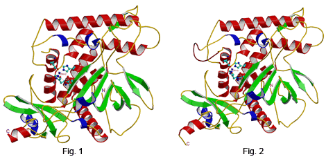 These "ribbon" diagrams illustrate the structures of the catalytic domain for wild type botulinum neurotoxin type E (left, fig. 1) and a related mutant protein (right, fig. 2). The overall conformation for the two proteins is the same; the only difference is that the amino acid gluatamate (GLU) in the wild type protein is changed to glutamine (GLN) in the mutant protein. This causes a loss of hydrogen bonding (shown by a dashed line in fig. 1) to the nearby nucleophilic water molecule, thereby increasing the distance between this water and the zinc atom in the mutant. This subtle change prevents the toxin from cleaving its target, thus abolishing its toxicity. Download as a hi-res tiff  file: Figure 1  |  Figure 2
