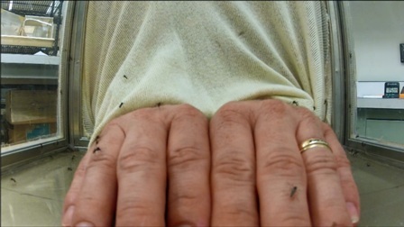 Ulrich Bernier, Ph.D., uses a hands-on approach for testing substances that block the mosquito’s sense of smell and ability to target humans. Credit: Greg Allen, USDA-ARS