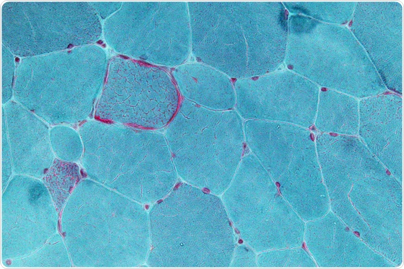 Micrograph showing ragged red fibres, a finding seen in mitochondrial diseases. Muscle