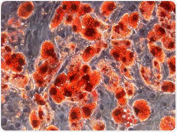 Caption: Human fat stem cells differentiated into adipocytes and stained with Oil Red O (Credit: Dr Mohamed Elrayess, Anti-Doping Laboratory Qatar).