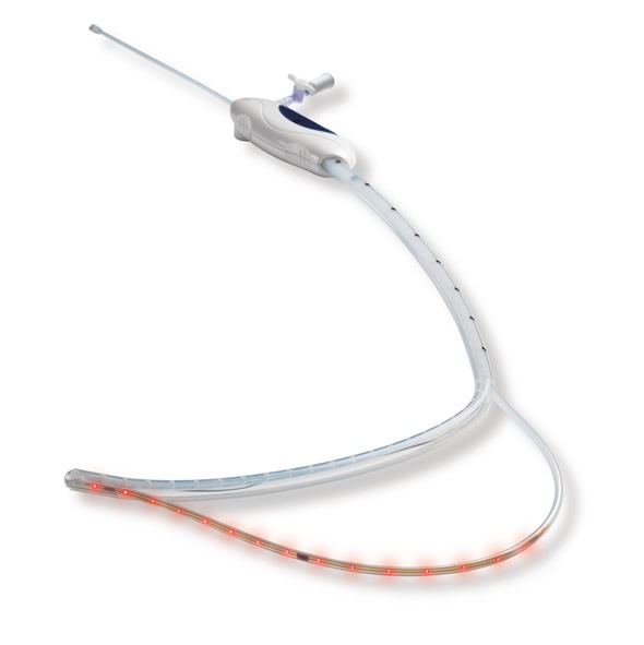 The GastriSail system can be used to help guide the surgeon's staple lines to ensure consistent shape of the stomach pouch from procedure to procedure. Once the surgeon positions the GastriSail system in the stomach, the system's unique LED lights illuminate through the stomach tissue allowing the surgeon to see a clear line delineating where the stomach should be dissected, stapled and divided.