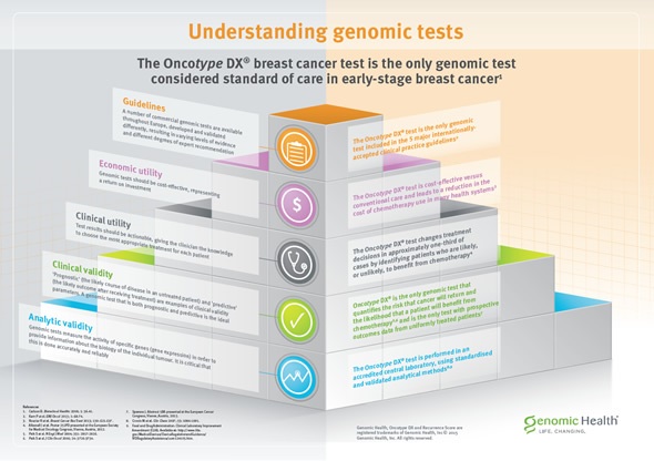 Genomic Health, Inc. is a world-leading provider of genomic-based diagnostic tests that inform treatment decisions and help to ensure each patient receives appropriate treatment for early stage cancer. The company applies its state-of-the-art scientific and commercial expertise and infrastructure to translate significant amounts of genomic data into clinically actionable results for treatment planning throughout the cancer patient's journey; from screening and surveillance, through diagnosis and treatment selection. The company is based in Redwood City, California with the local UK office in London. For more information, please visit, www.GenomicHealth.co.uk. To learn more about Oncotype DX, visit: www.OncotypeDX.com