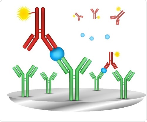 Secondary antibodies binding primary antibodies. The result is visible under a microscope.