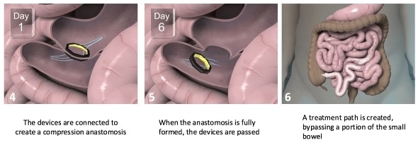 The dual-path enteral diversion was created with a flexible endoscope, as smart, magnetic devices are deployed from the scope and self-assemble in the small bowel. The devices transform from a linear shape to an octagonal geometry and then couple to form an anastomosis -- a connection between two hollow or tubular structures or organs. Coupled devices are eventually expelled naturally, leaving behind an anastomosis without residual foreign material. Patients enrolled in the study were restricted to a two-week post-op liquid/soft diet, underwent an upper GI series to confirm anastomotic patency (the degree of openness or exposure) at two weeks post implant, and received follow-up endoscopies at two and six months to visualize the anastomosis.