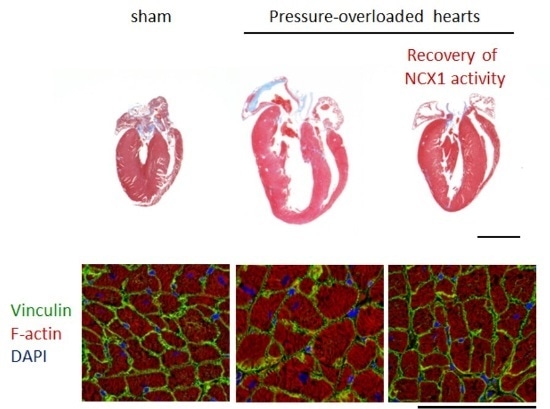 Recovery of NCX1 activity attenuates the progression of pathological cardiac remodelling after pressure overload. (upper panels) Histological sections of sham- and pressure overloaded hearts with or without the recovery of NCX1 activity. Scale bar, 5 mm. (Lower panels) Cross section of cardiac tissue in these hearts. Scale bar, 100mm.