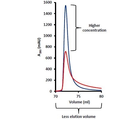 Figure 1: Normal (red) and reversed flow elution (blue) of affinity runs.