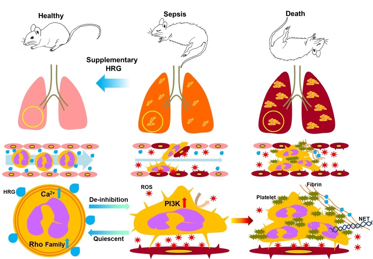 Decrease in plasma HRG in septic condition triggers the deformation of circulating neutrophils and the tight attachment of these cells to vascular endothelial cells, associated with ROS production and endothelial cell injury . This in turn facilitates the NETosis, platelet aggregation and coagulation, leading to immunothrombosis and multiple organ failure.