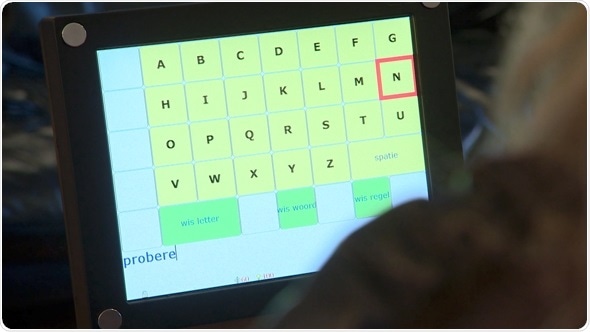 The patient operates the speech computer by moving her fingers in her mind. This changes the brain signal under the electrodes. That change is converted into a mouse click. On a screen in front of her she can see the alphabet, plus some additional functions such as deleting a letter or word and selecting words based on the letters she has already spelled. The letters on the screen light up one by one. She selects a letter by influencing the mouse click at the right moment with her brain. That way she can compose words, letter by letter, which are then spoken by the speech computer. This technique is comparable to actuating a speech computer via a push-button (with a muscle that can still function, for example, in the neck or hand). So now, if a patient lacks muscle activity, a brain signal can be used instead.
