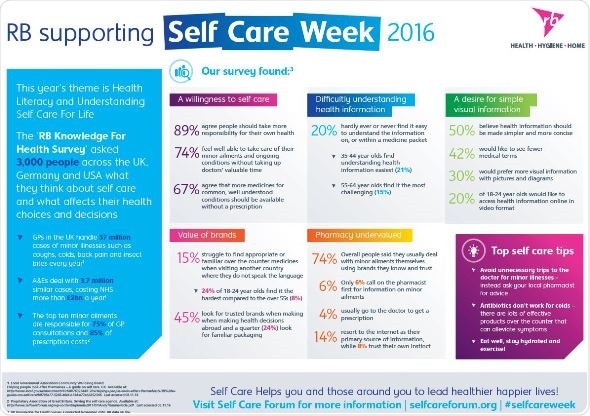 RB, the world’s leading consumer health and hygiene company, is supporting Self Care Week, a UK national initiative which seeks to support communities, families and generations to look after their own health better. Health Literacy, which is the focus for this year’s campaign, represents a major barrier to self care with some research suggesting that health information is too complex for 60% of adults in England to understand. With the health service under increasing pressure, improving understanding and encouraging positive behaviour change through self care, could enhance the ability of people to manage their own minor illnesses and reduce needless costs to society, health systems, individuals and companies.