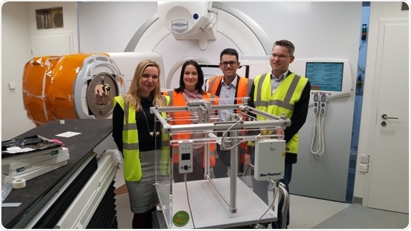 The Blue Phantom² distributed by Oncology Systems Limited is supporting advanced cancer treatment at Proton Partners International. [Right to left: Asia Baginska, Medical Physicist at Oncology Systems Limited; Josephine Clorley, Senior Medical Physicist; Ignacio Di Biase, Deputy Head of Physics and John Pettingell, Head of Physics at Proton Partners International]