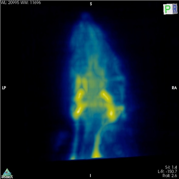 Perfusion in a rat brain imaged using Magnetic Particle Imaging technology.