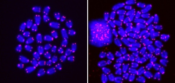 The right panel is an example of a caspase-2 deficient mouse tumour cell, which has an abnormal number of chromosomes.