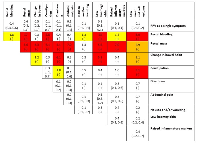 It gives the risk of serious disease (i.e. cancer or IBD) as a percentage figure derived from our very large study. This is given first for a single symptom, like rectal bleeding alone, then for two different symptoms.