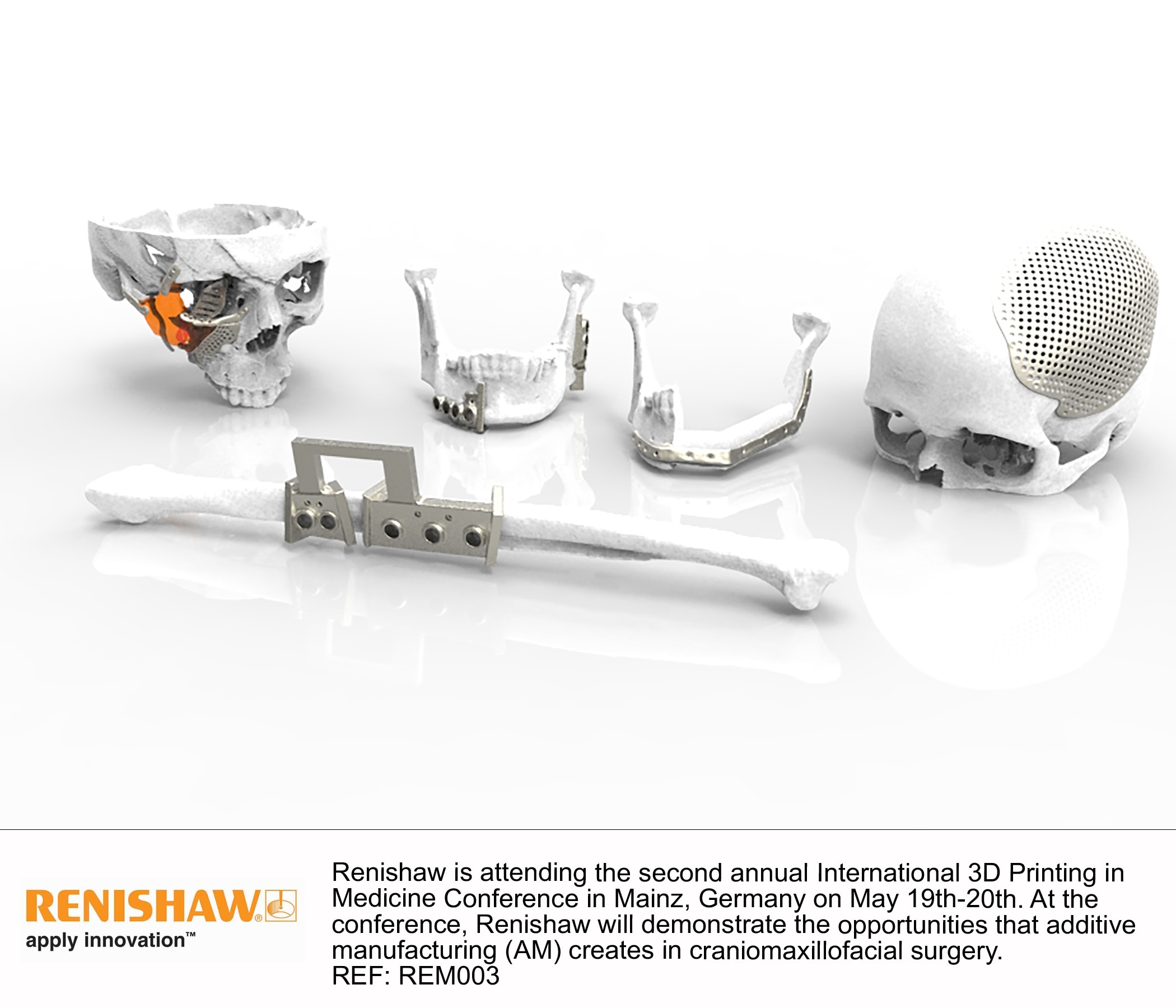 Global engineering and healthcare technologies company, Renishaw, is attending the second annual International 3D Printing in Medicine Conference in Mainz, Germany on May 19th-20th. Renishaw will demonstrate the opportunities that additive manufacturing (AM) creates in craniomaxillofacial surgery, by exhibiting its bespoke implants and providing demonstrations of its new implant design software, Additive-manufacture for Design-led Efficient Patient Treatment (ADEPT).