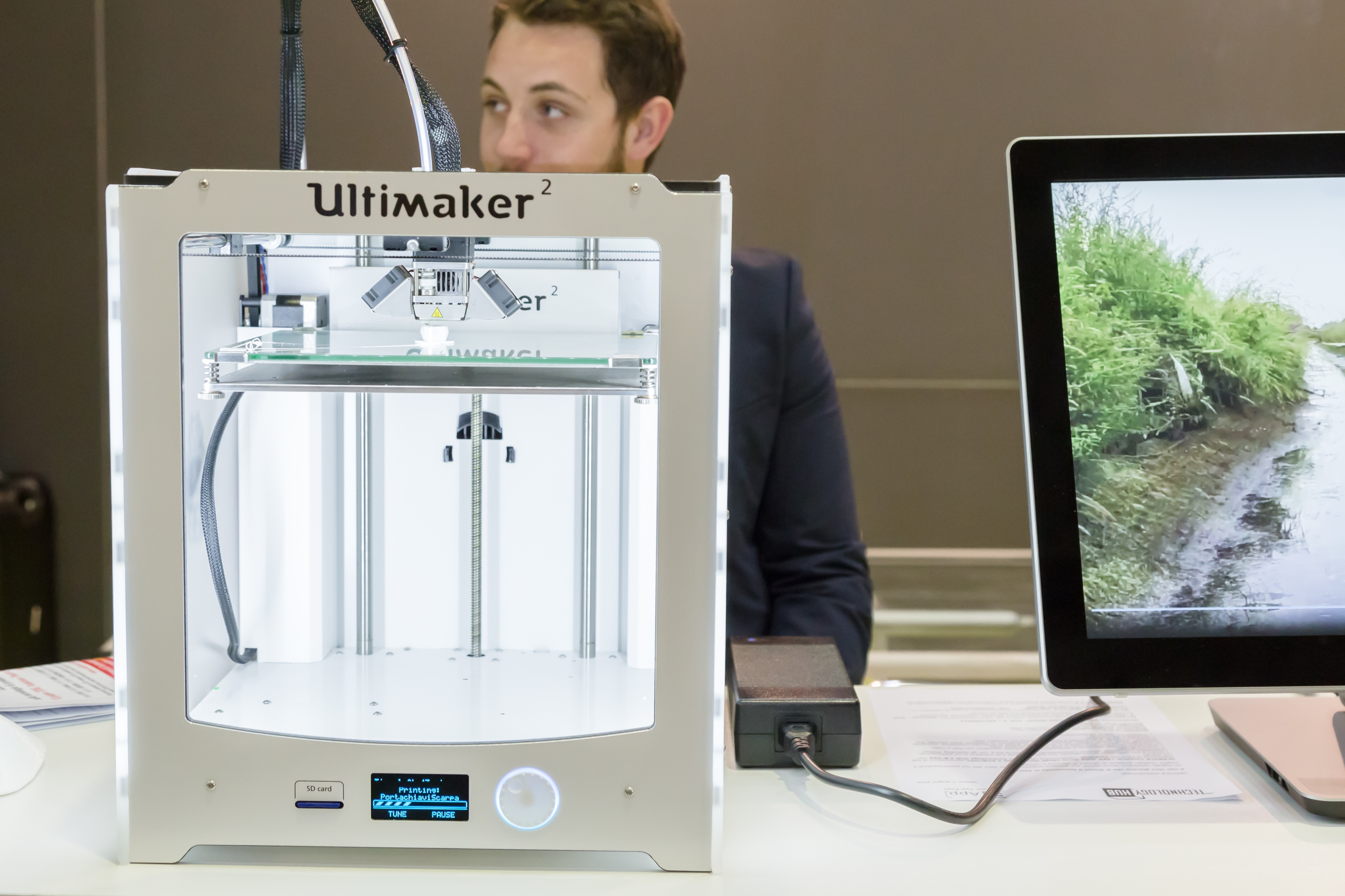 The type that Ultimaker specializes in is called fused filament fabrication. Basically, you have a roll of filaments that is then extruded through a hot end melted and then is bonded layer by layer in increasing layers, to give you the 3D model of the file format you sent across.