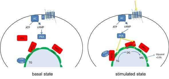 In a basal state (on the left before the hormonal lipolysis signal occurs), the activating protein CGl58 and the regulating protein perilipin are bound together. Once lipolysis is activated (on the right), one of the two proteins is marked with phosphate (phosphoryliation) and CGI58 separates from peripilin to activate the first of three lipases (enzymes that break down fat) named ATGL. Quelle: Ruth Birner-Grünberger, Meduni Graz
