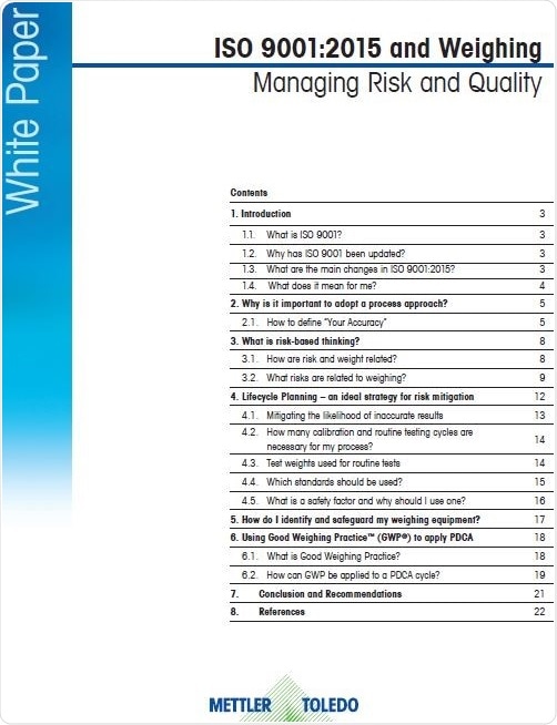 This free white paper explains the ISO 9001:2015 changes and their implications for weighing processes. It explains what risk-based thinking involves and how to apply it to weighing processes, in order to establish optimum calibration and routine testing plans. It also describes Good Weighing Practice, which is a perfect fit for compliance with ISO 9001:2015, and offers the ideal way to apply a PDCA cycle for weighing processes.