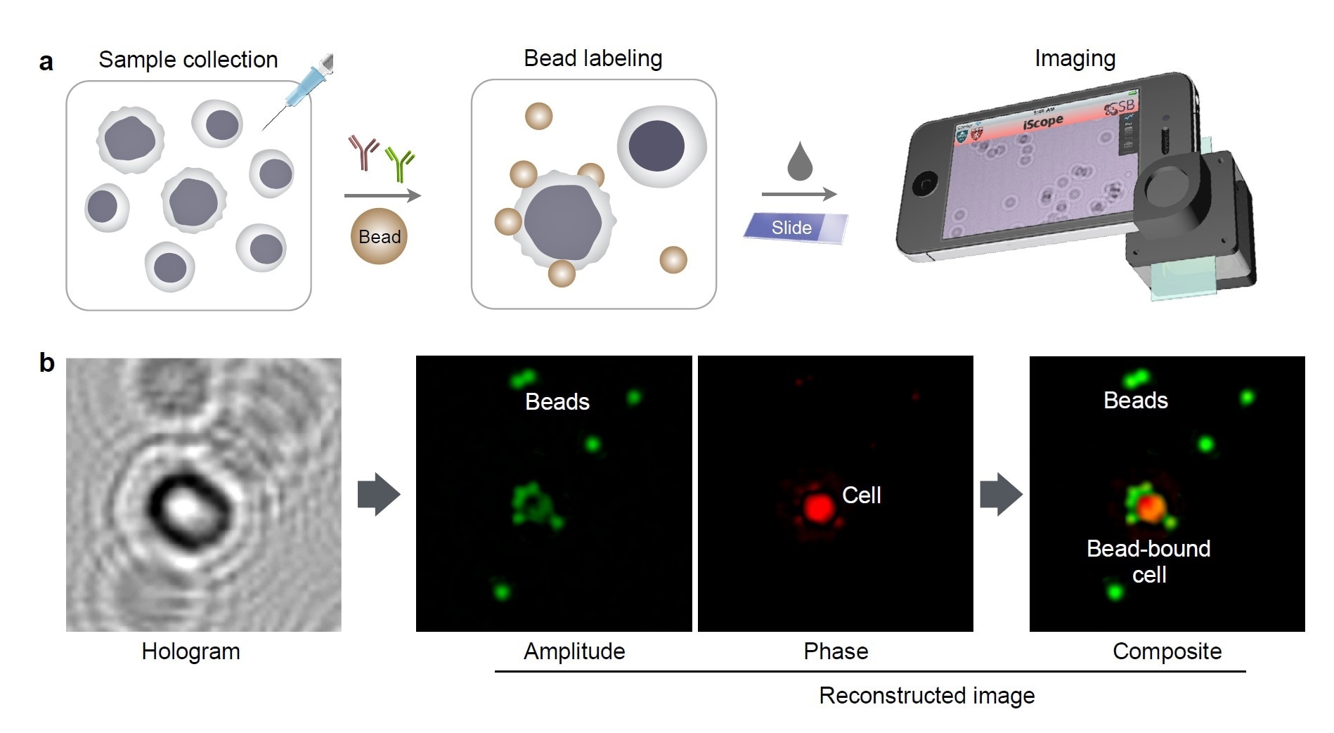 Molecular detection with holography. (a) Schematic of holographic assay for cancer cells collected by fine needle aspiration. (b) A hologram image is reconstructed for complementary amplitude and phase contrast images. The amplitude (green) and phase contrast (red) images are pseudocolored for better visualization of cells and beads.