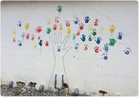 The Makeni Ebola Treatment Unit survivor wall, where patients who survived Ebola would add their handprint to the wall as they were discharged. Credit: Adam Levine
