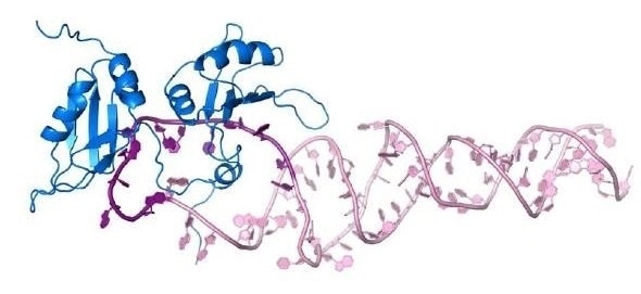 The authors were able to show exactly how a specific RNA binding protein (blue) recognizes pri-miR-18a (pink) and changes its structure in such a way that it develops into mature miRNA-18a. Picture modified from Kooshapur et al.