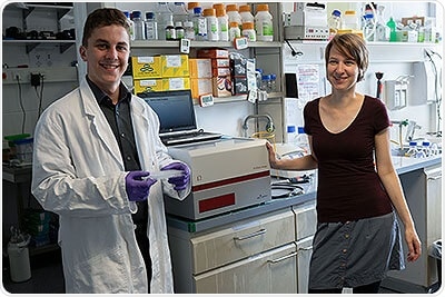 On Thursday, the 20th of July, the high-school life science laboratory in Ohlsbach, Germany received a FLUOstar® Omega microplate reader donated by BMG LABTECH. The device enables the young scientists to expand their research capabilities. Application Specialists Andrea Krumm and Jendrik Marbach, representing BMG LABTECH, handed over the microplate reader to Tobias Stadelmann, high-school graduate of Marta-Schanzenbach-Gymnasium, from the student lab. The aim of the lab is to give young scholars of mathematics, computer science, life science and technology the possibility to work on their own research projects.