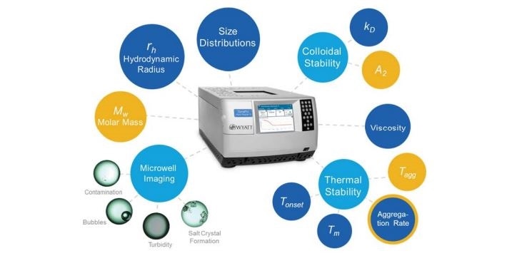 For biotherapeutic formulation and development, the new DynaPro Plate Reader III is a comprehensive solution for stability evaluation. The instrument can measure aggregation, aggregate size distributions, changes in solution molecular weight, and propensity for aggregation: indicators of both thermal stability (Tonset, Tm, Tagg) and colloidal stability (A2/B22, kD) may be quantified with plate-based DLS and SLS. Even viscosity of concentrated protein solutions can be screened across dozens of formulations in a single plate.