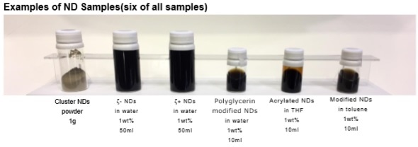 ND samples contain ζnegative potential NDs water dispersion, ζpositive NDs, polyglycerin modified NDs, and chemically modified NDs in organic solvents.