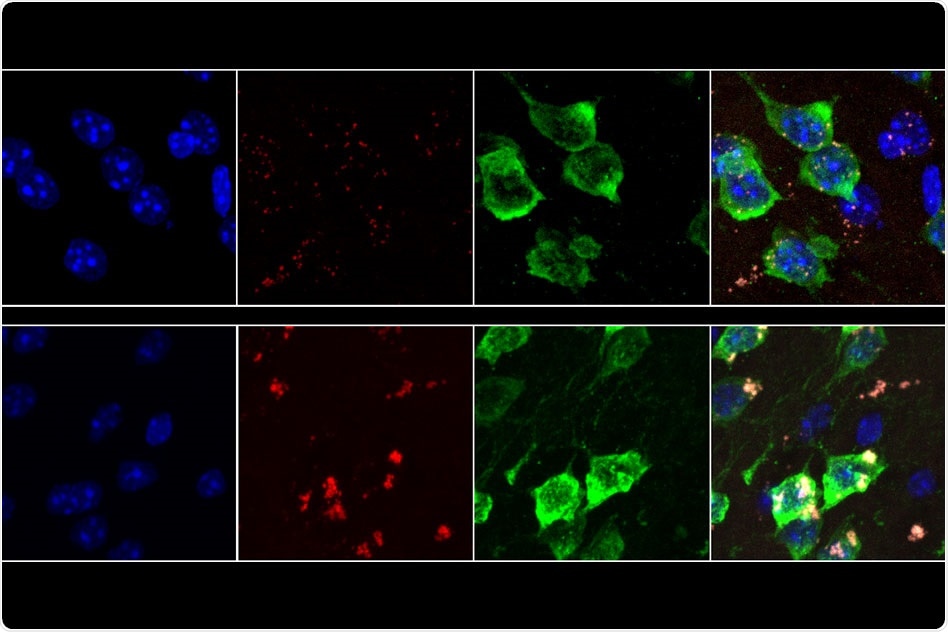 Neurons from 19-month-old mice (bottom row) show much higher rates of oxidative stress than neurons from 9-week-old mice (top row). Lipofuscin, a molecule associated with aging-related oxidative stress, appears red. (Credit: Hyeseung Lee)