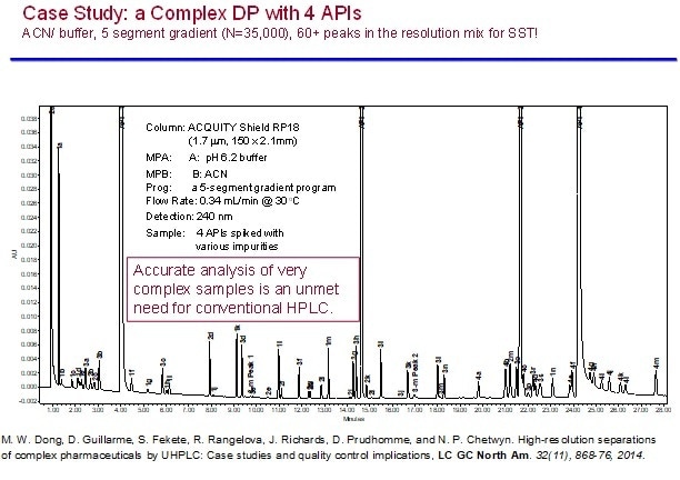 The second case study illustrates the high-resolution capability of a well-developed UHPLC method for a drug product with 4 APIs using a 5-gradient-segment method capable of separating up to 60+ impurities in a robust manner.