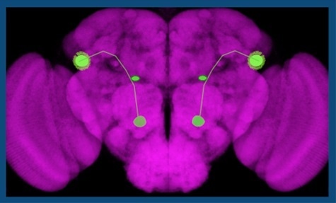 The green shows neural circuits controlling the sense of smell in the brain of a common fruit fly, Drosophila melanogaster. Credit: Chris Potter